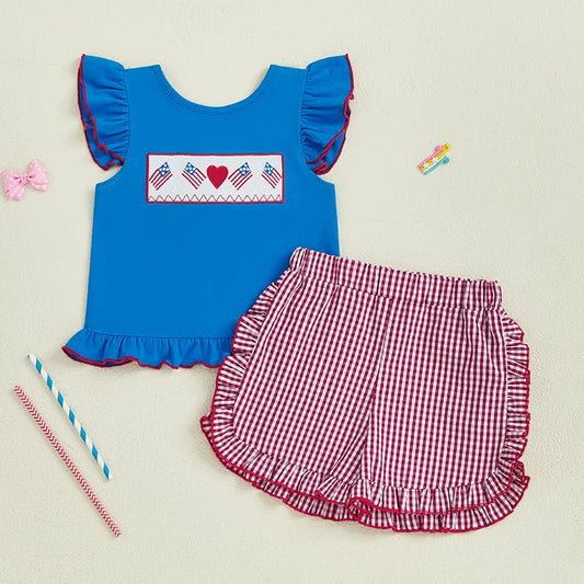 Girl's 2-Piece Embroidered 4th of July Fly Sleeve Tops & Plaid Ruffled Shorts Sets