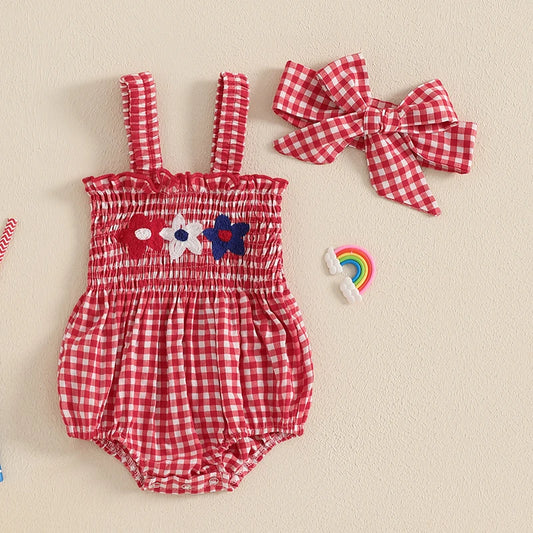 Girl's 2-Piece Embroidered July 4th Rompers & Bow Head Band Sets