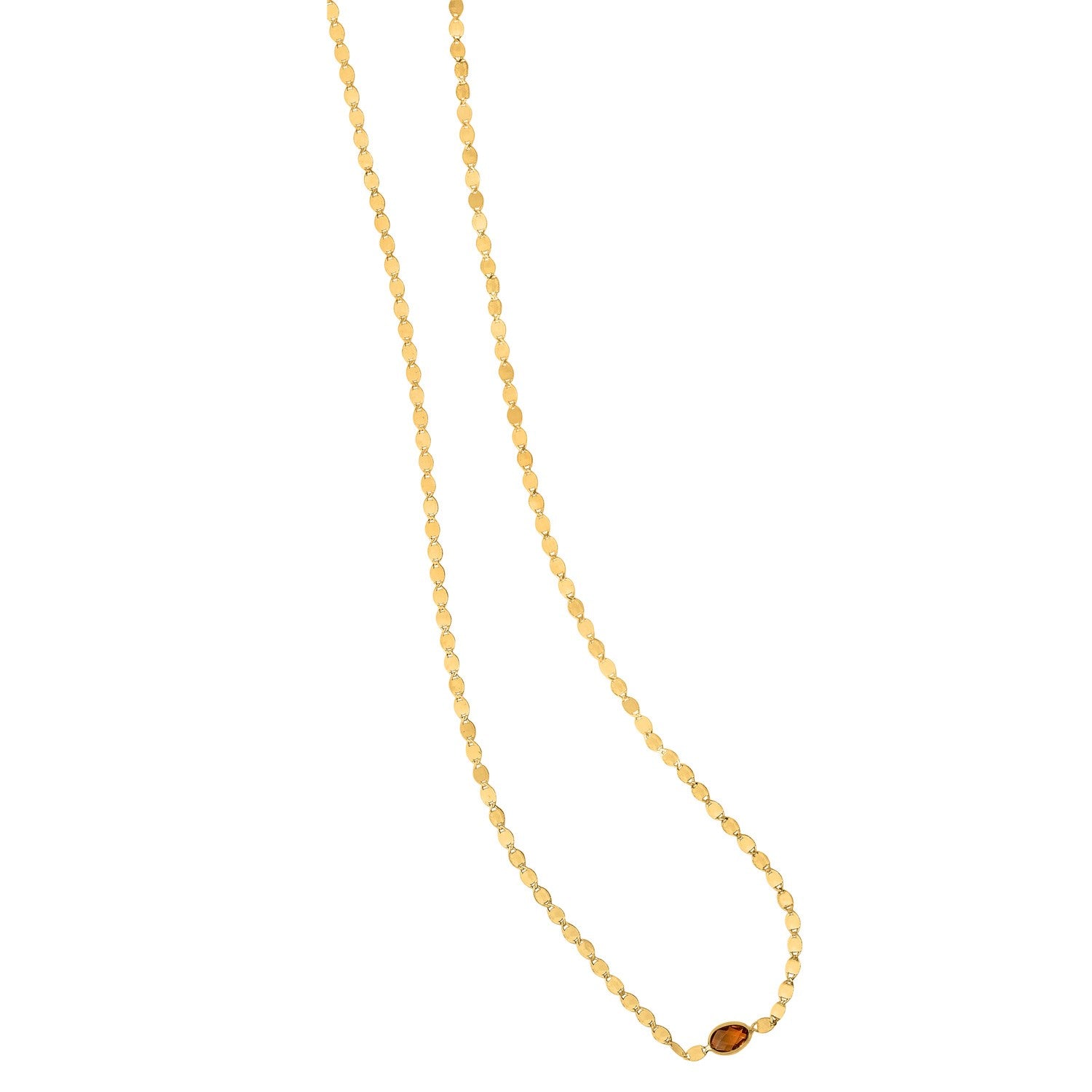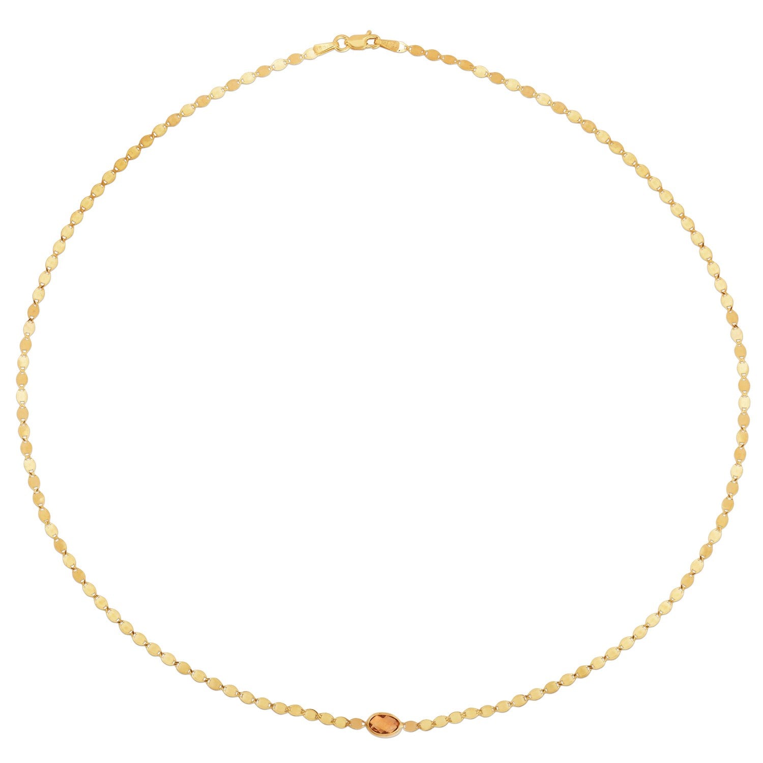 Crafted in lustrous 14K yellow gold, this elegant mirrored chain features a vivid 6×40 mm oval Citrine center, adding a touch of regal color. The sleek 2.20 mm mirrored chain beautifully reflects light, creating a subtle shimmer with every movement. Measuring 16 inches in length and finished with a secure lobster clasp, this piece merges timeless craftsmanship with wearable glamour.