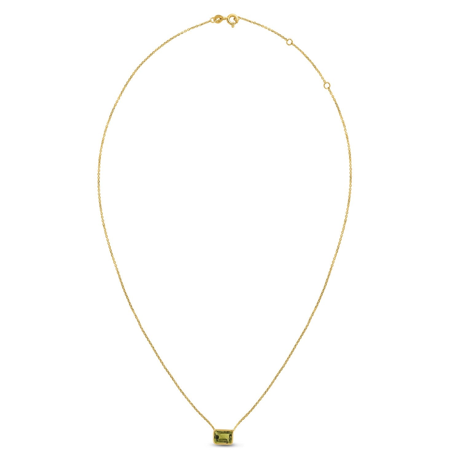 Elevate your elegance with this exquisite 14K yellow gold Emerald Cut Peridot necklace. Designed with a delicate 0.90 mm chain and a striking 9.70 × 7.10 mm emerald cut peridot stone, this piece measures 18 inches and adds a touch of vibrant color and sophistication. Finished with a polished shine and a secure spring ring clasp, it’s perfect for dressing up any look.