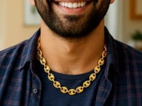 This puffed mariner link chain comes in 14k yellow gold and has a width of 9.0 millimeters.