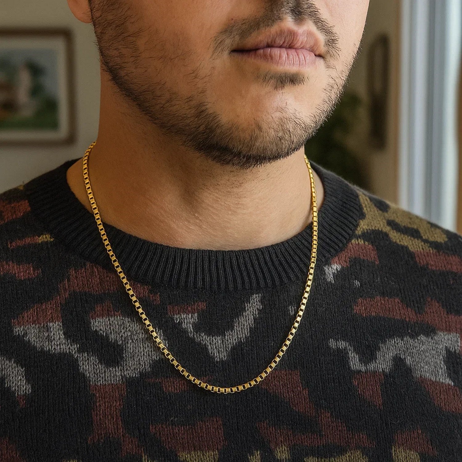 This semi-solid box chain comes in 14k yellow gold and has a width of 1.80 millimeters.