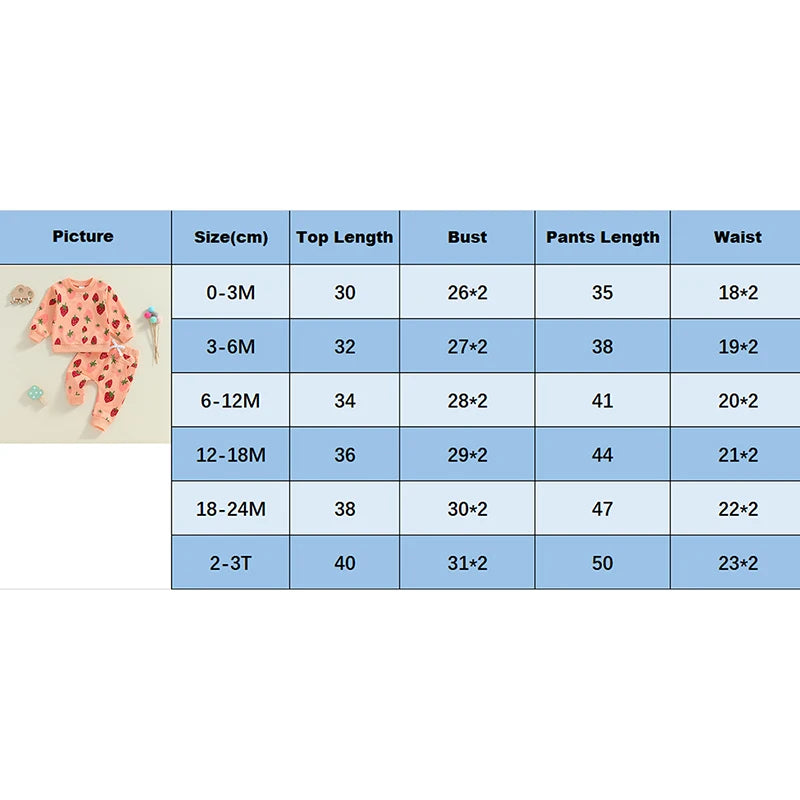Each size sold separately and includes one outfit (1 long sleeve strawberry print sweatshirt + 1 pair of pants). Cozy and comfortable cotton, polyester, spandex blend.