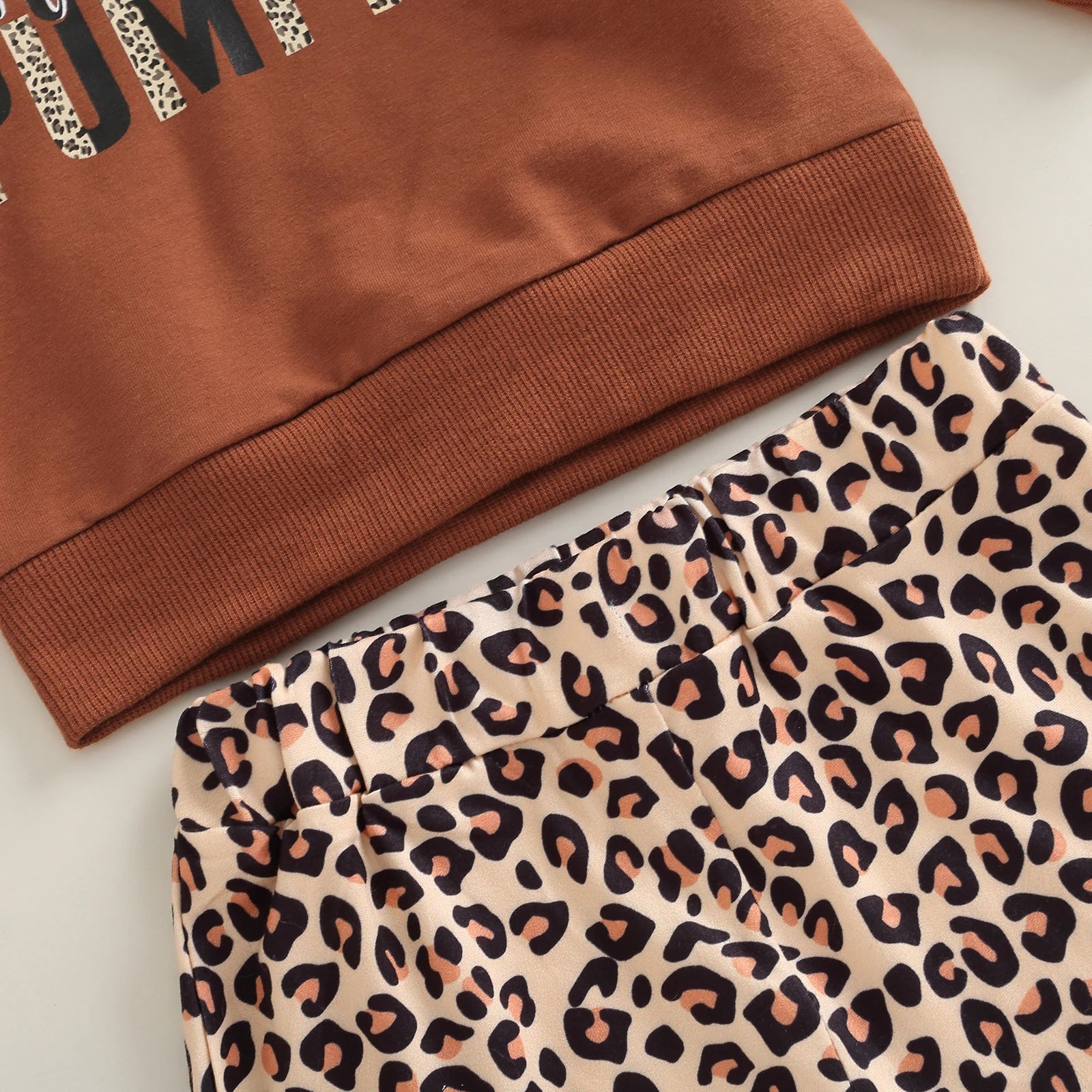 Girl's "Hello Pumpkin" Leopard Print Sweatshirts & Flared Pants Sets