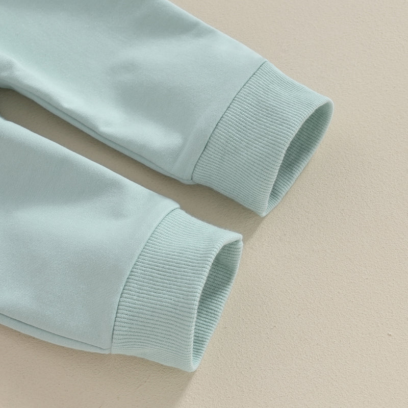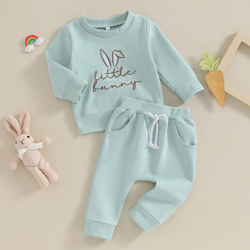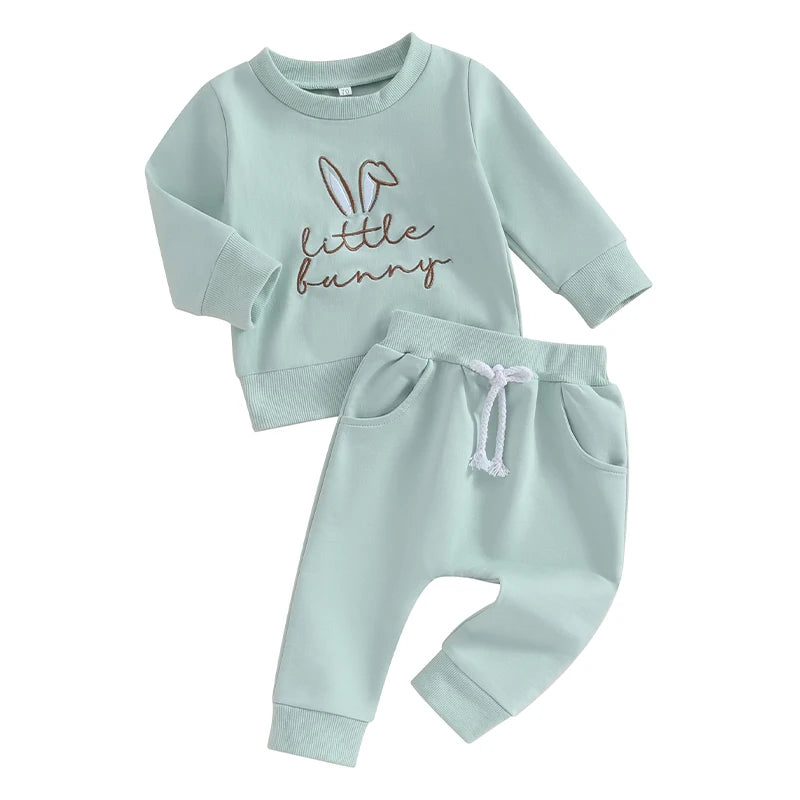 Each size sold separately and includes one outfit (1 sweatshirt + 1 pair of pants). Material: Cotton, Spandex. Season: Fall. Gender: Baby Girl. Pattern: Letter Bunny Embroidery. Sleeve: Long Sleeve.