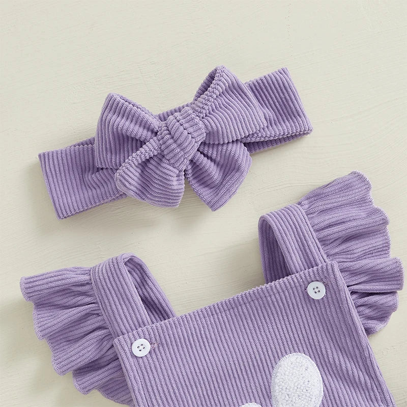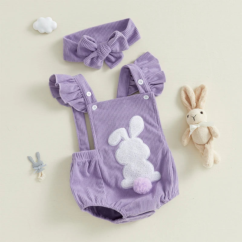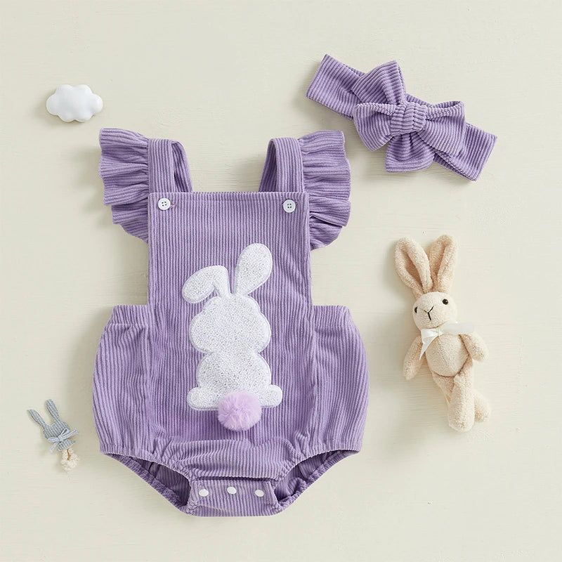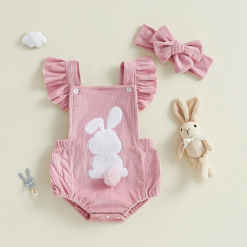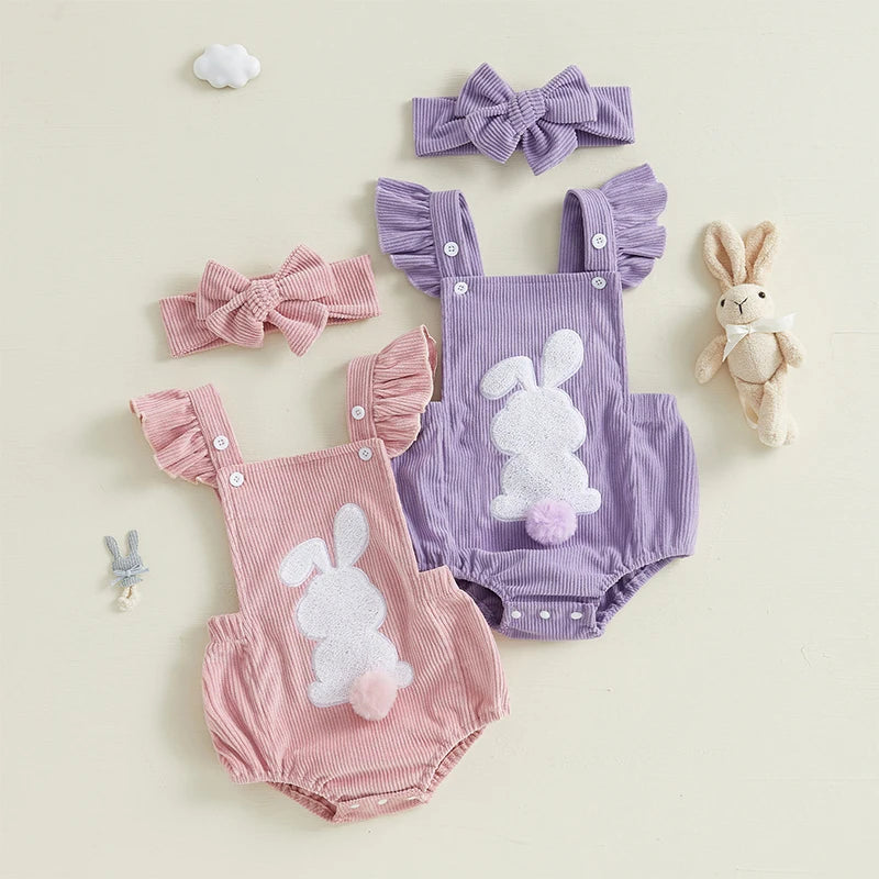 Girl's Fly Sleeve Embroidered Easter Bunny Romper & Headband Sets