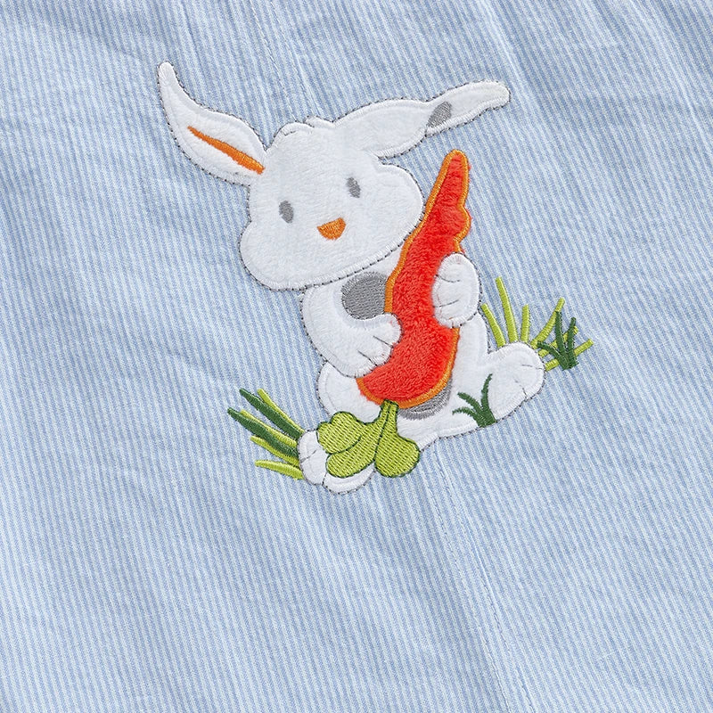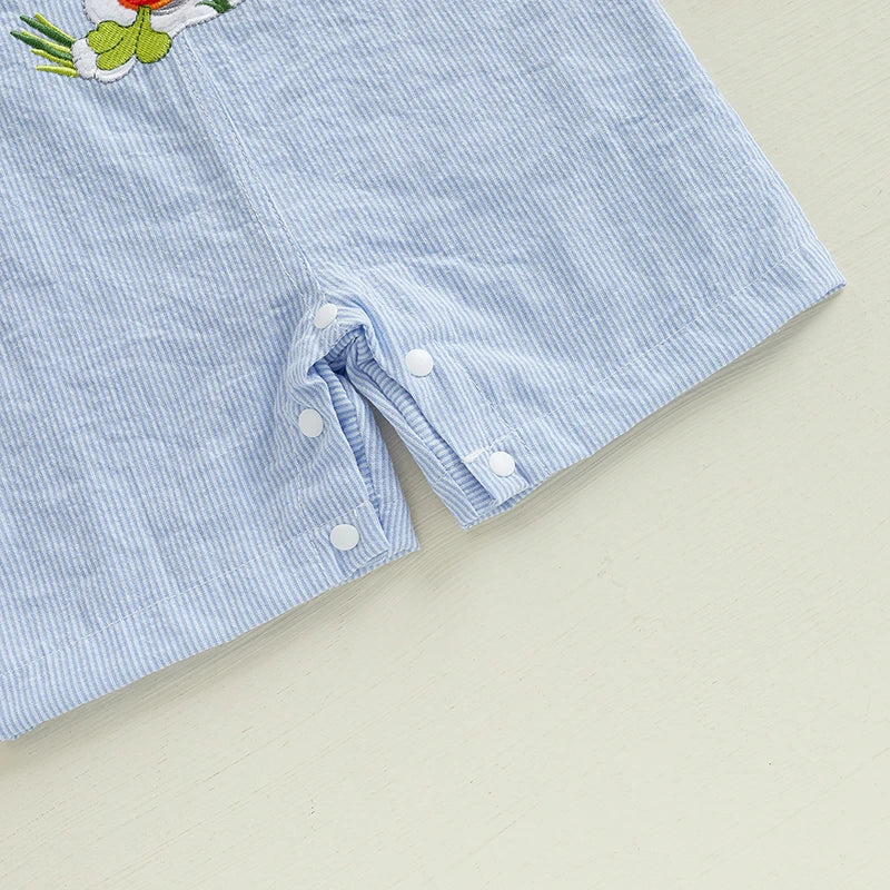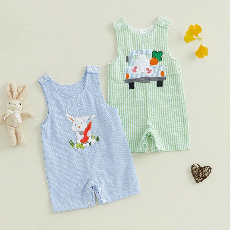 Each size sold separately and includes one romper. Material: Cotton, Polyester. Color: Green, Blue. Pattern: Striped, Bunny Truck Carrot Embroidery. Gender: Infant. Sleeve: Sleeveless.
