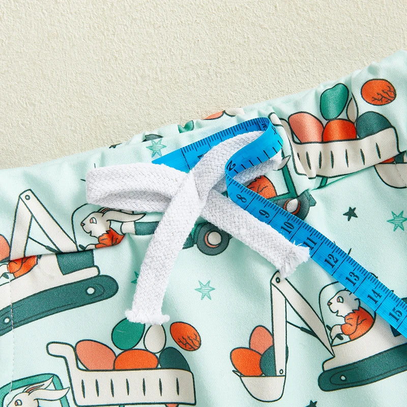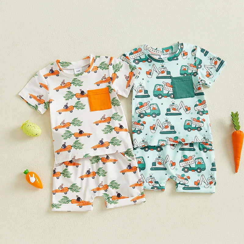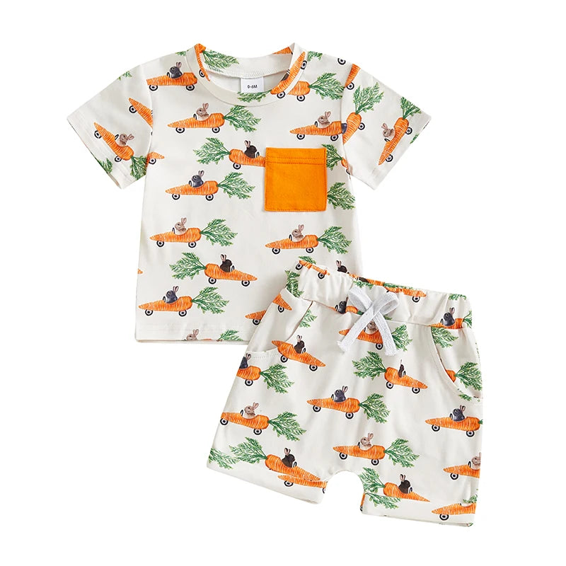 Each size sold separately and includes one outfit (1 T-shirt + 1 pair of shorts). Material: Polyester, Elastane. Color: Blue, Orange. Pattern: Bunny, Carrot, Crane, Easter Egg, etc. Gender: Boys, Baby Boys. Sleeve: Short Sleeve. Crew Neck.