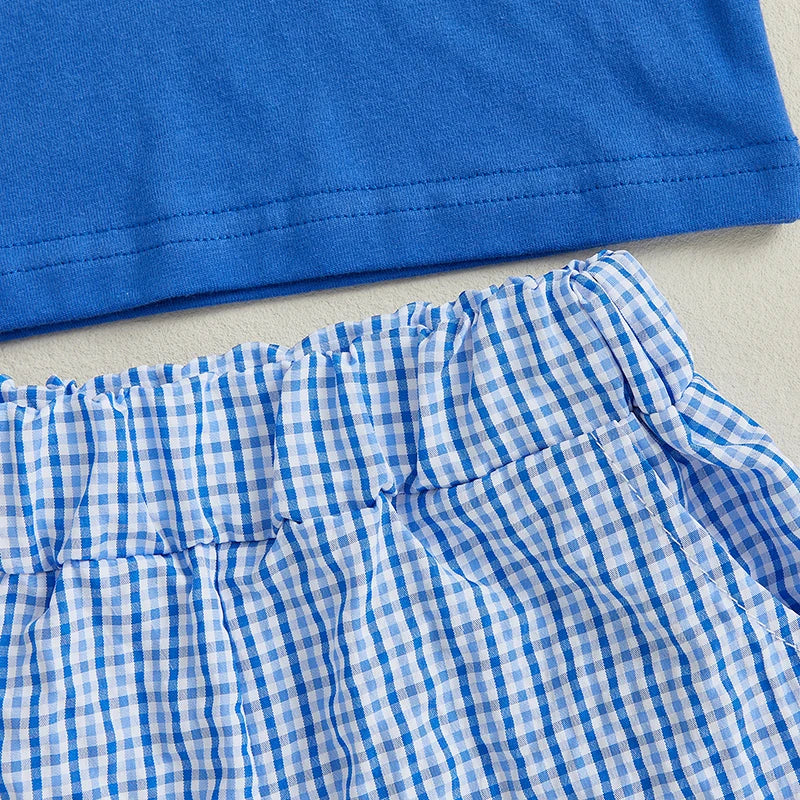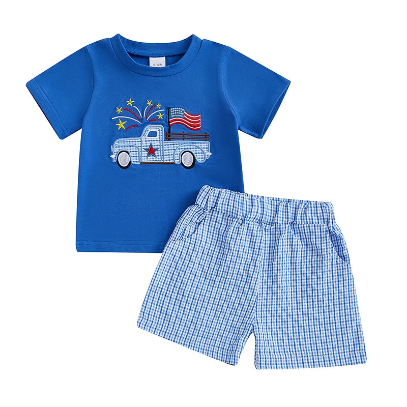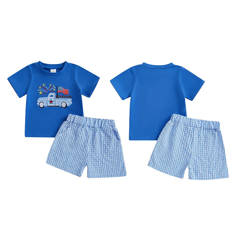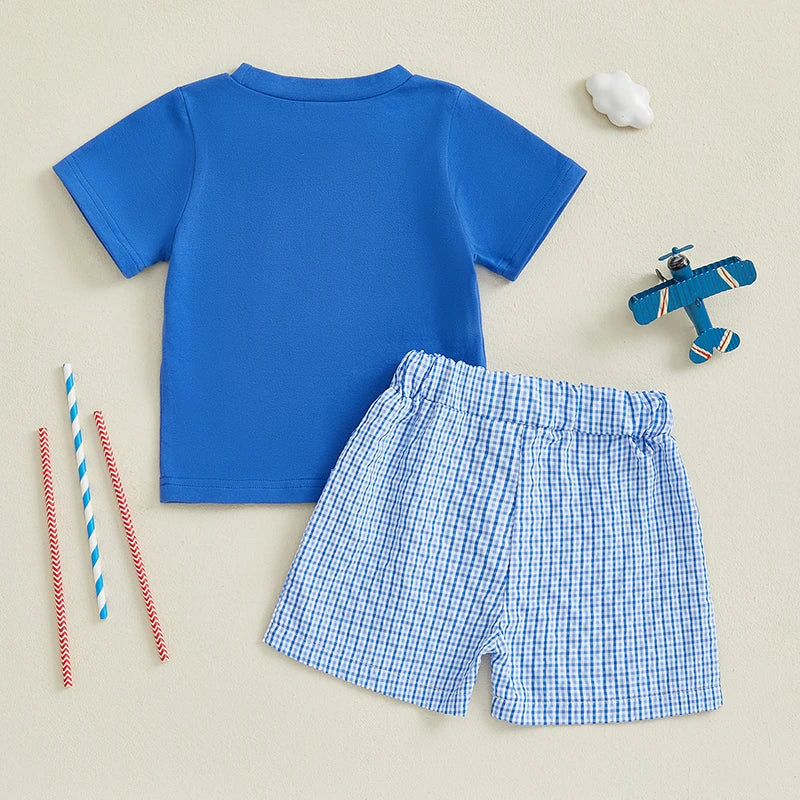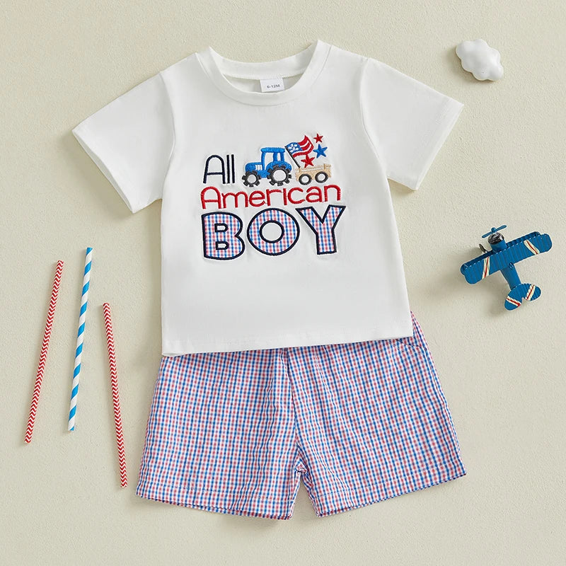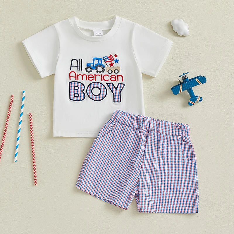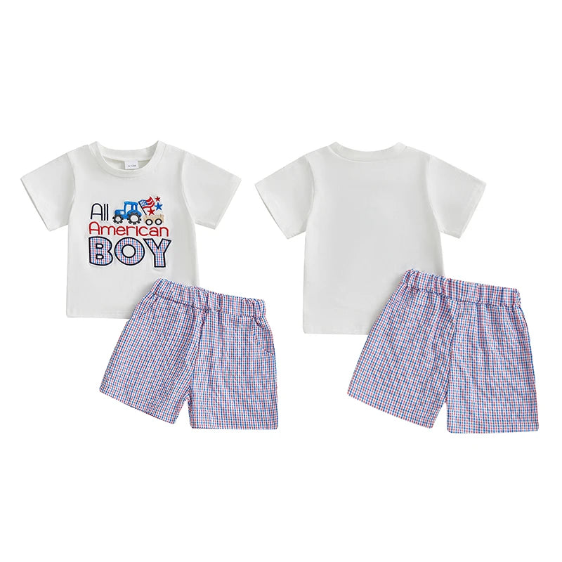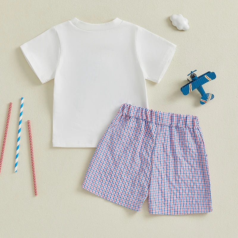 Boy's 2-Piece Embroidered 4th of July T-Shirts & Plaid Shorts Sets