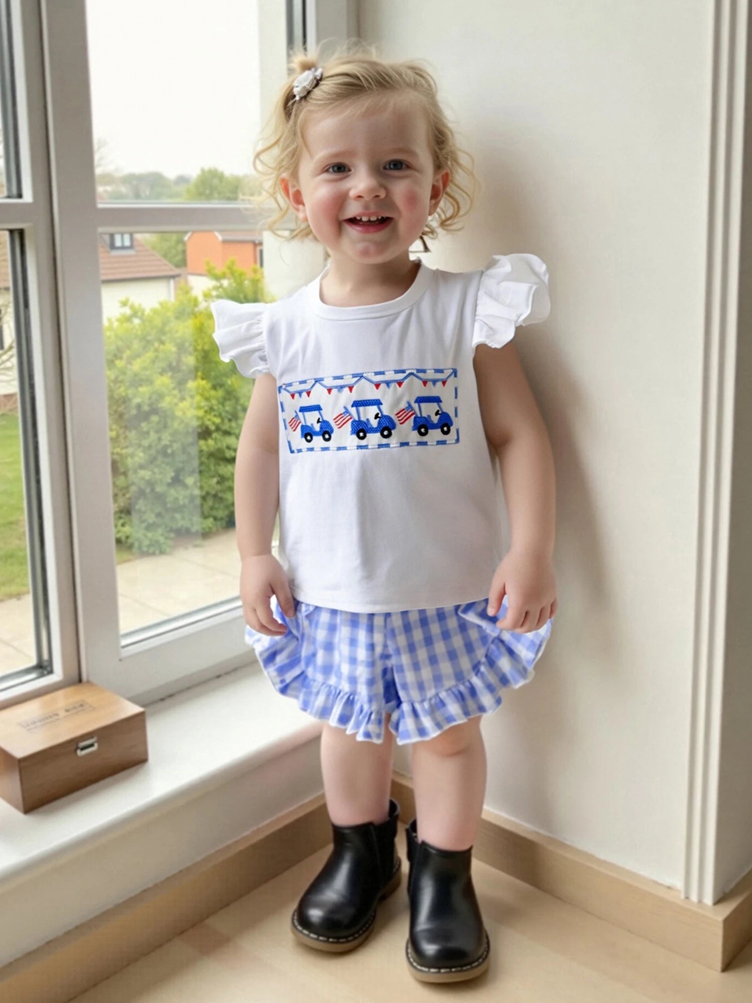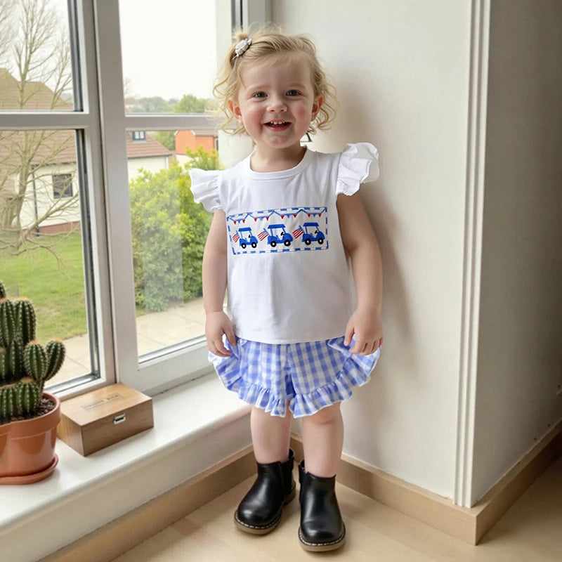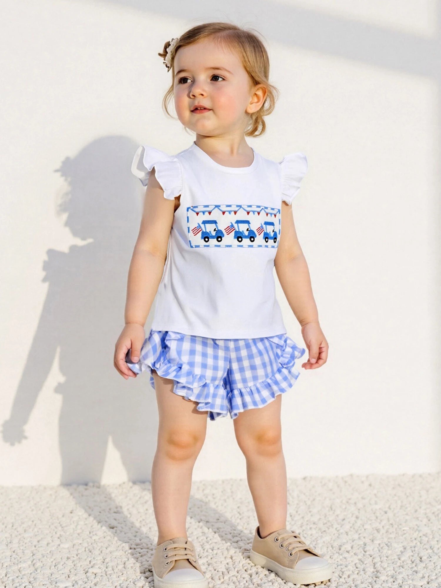 Girl's 2-Piece Embroidered 4th of July Fly Sleeve Golf Cart Top & Ruffled Plaid Shorts Sets
