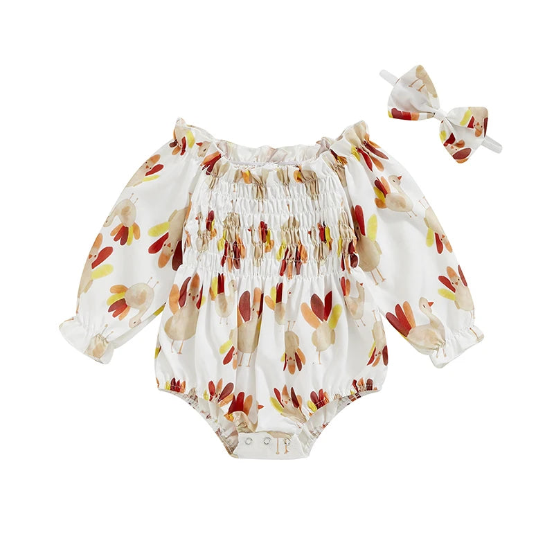 Thanksgiving ! Girl's Turkey Romper & Bow Headband Sets